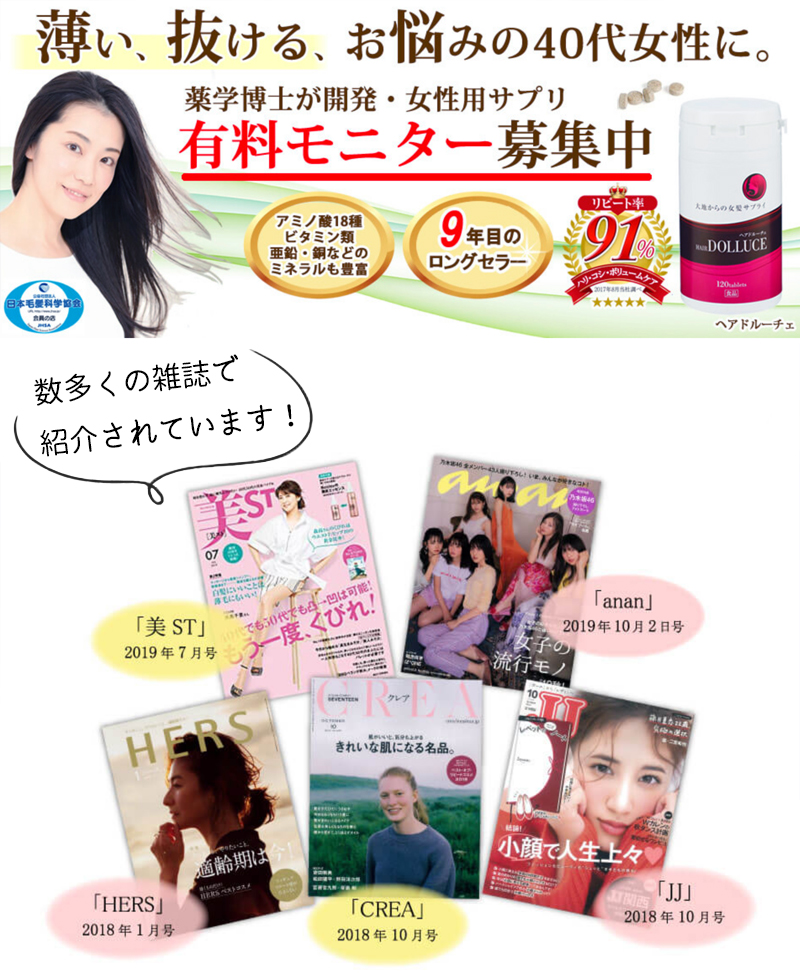 今回は、年齢とともに髪にハリやコシが出づらくなった方や、ボリュームが気になる方にオススメなへアドルーチェをご紹介します。薬学博士が開発した女性用サプリなので安心して使うことができますよ。